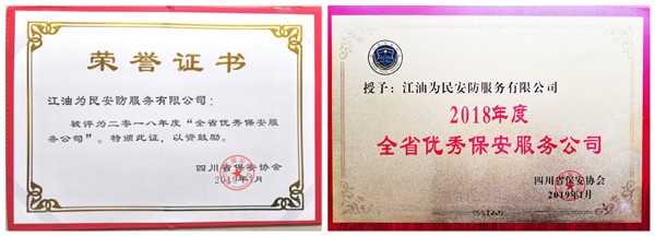 2019年1月22日,四川省公安厅治安总队、省保安协会在成都召开第四届六次常务理事会议上,对评选出的先进保安服务公司,先进保安员进行表彰并颁发了证书和奖牌。江油为民安防服务有限公司被评为四川省十家“全省优秀保安服务公司”。江油为民安防服务有限公司是江油市最早成立的安防服务企业,是川西北地区最大的安防服务企业,是四川省保安协会常务理事单位、绵阳市保安协会副会长单位、江油市物业协会副会长单位、绵阳市工商行政管理局守合同重信用企业、江油市住建局诚实守信企业。公司前身系江油市保安服务有限公司,脱钩改制后更名为江油为民安防服务有限公司,在激烈的安防行业市场竞争中,依靠自身力量独立发展。