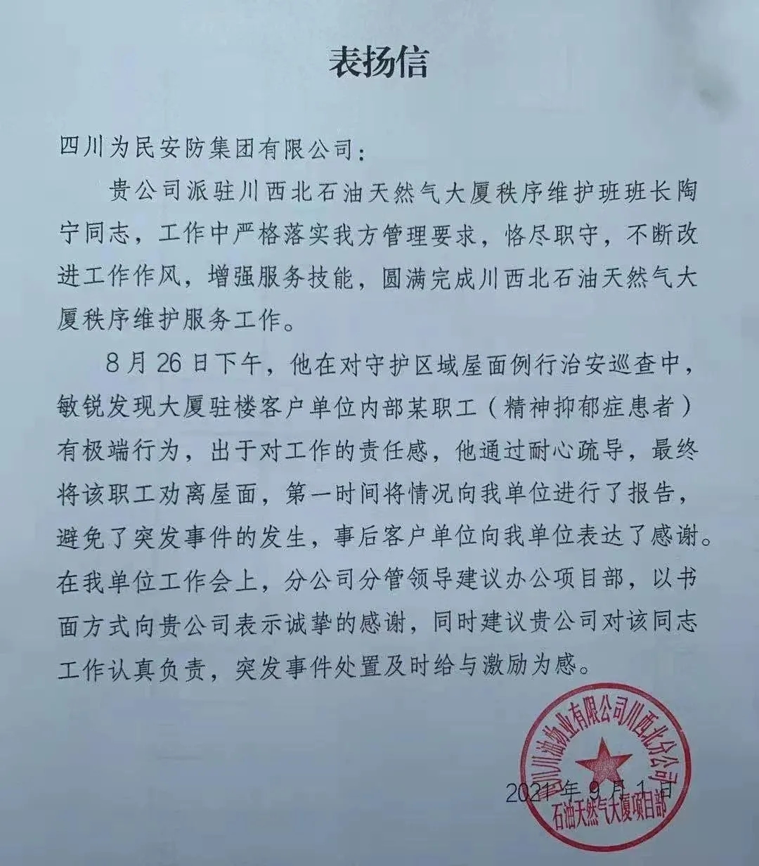 2021年8月26日,人防分公司石油大厦项目部班长陶宁同志,工作勤奋,履职认真,发现并成功排除重大安全隐患,得到客户单位高度赞扬!