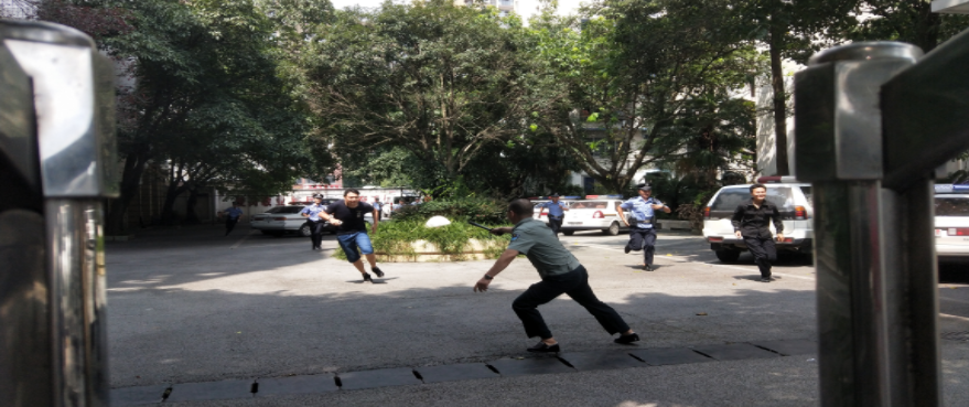 演练有条不紊的进行,所有人员都全身心投入到演练中。演练真实的模拟了突发事故现场。在“法院上访闹事”事故中,保安员及时排查出“上访人员”,通知法警成功拦截了“上访人员”,阻止“上访人员”进法庭滋扰闹事。接着保安员得到法庭罪犯逃跑的消息,为了防止“罪犯”逃脱,造成混乱,保安和法警密切配合,采取紧急拦截战术,联合包抄,成功抓获了“逃跑的罪犯”,有利挽回了失控的局面。对于现场中可能出现的突发疾病事故,教练员现场示范心脏复苏、人工呼吸等急救方法,普及了人员医疗急救知识,增强了人员应急救治能力。
