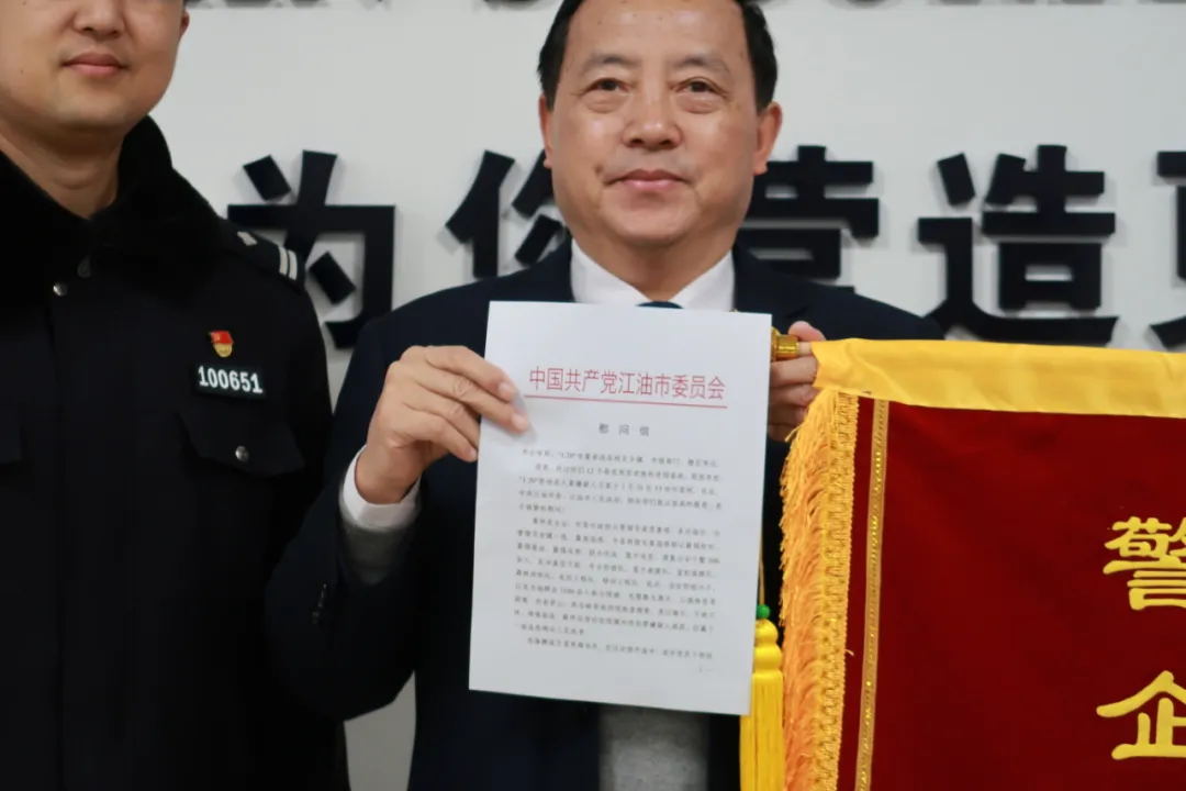 江油为民安防服务有限公司董事长刘光荣代表公司接收了旌旗和慰问信,并表示公司在此案件中贡献出了自己的科技力量、维稳力量、责任担当,全体员工将特别珍惜这份荣誉,也激励着公司员工更加努力地做好本职工作,任重而道远,为维护社会治安贡献我们最大的力量。