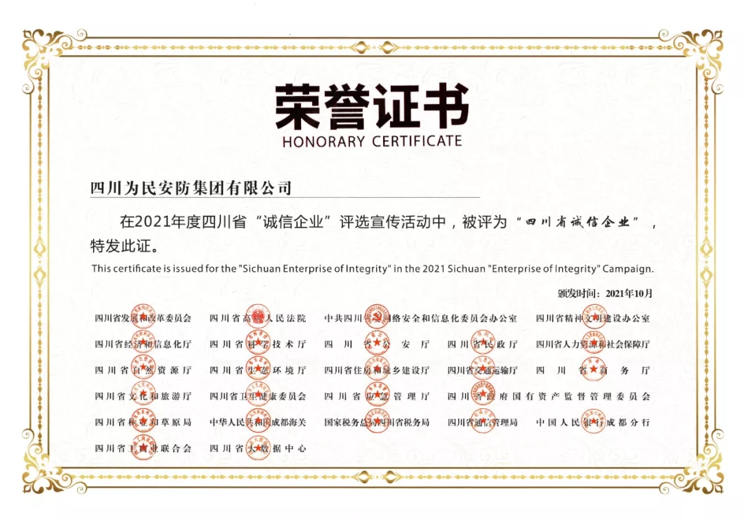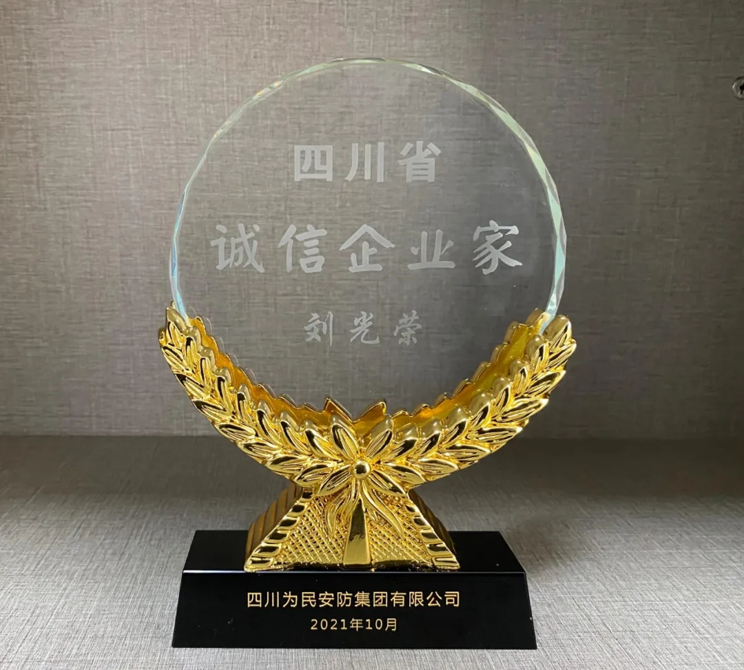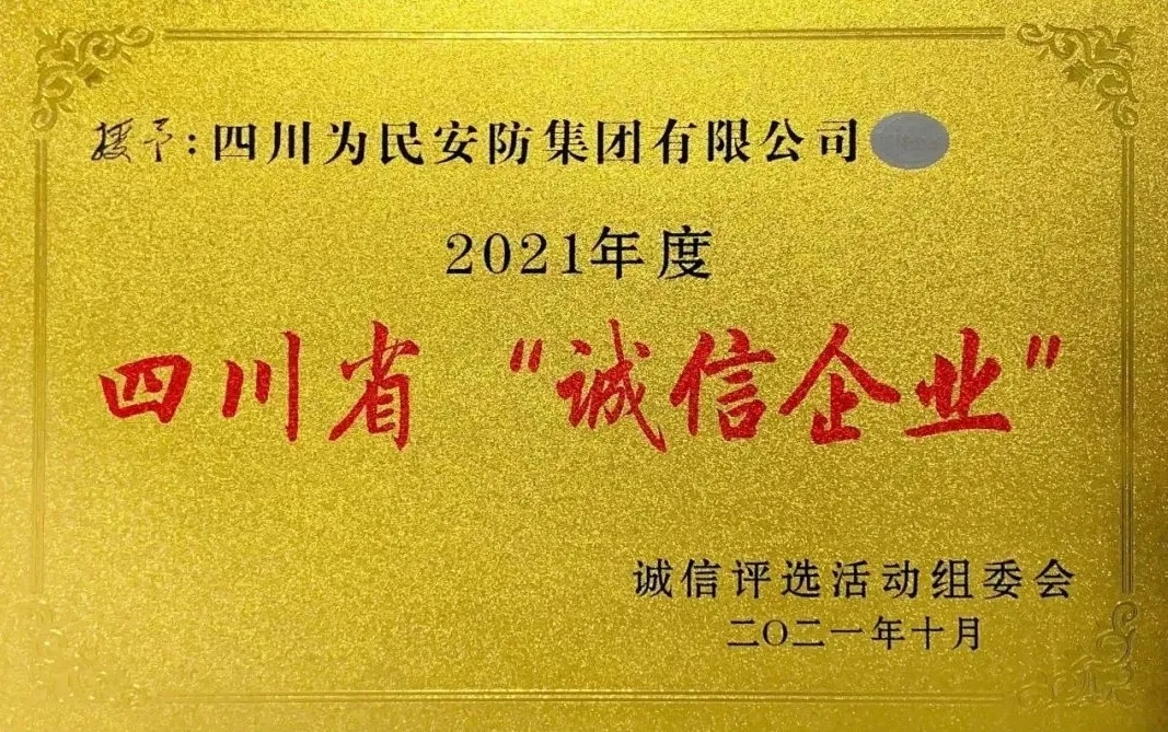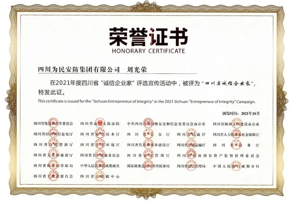 2021年11月12日,2021年四川省“诚信企业家”及“诚信企业”评选结果出炉,江油本土企业四川为民安防集团有限公司凭借诚信为本、锐意进取的社会责任担当在评选中脱颖而出,获得“诚信企业”殊荣;公司党总支书记、董事长刘光荣先生荣获“诚信企业家”称号。